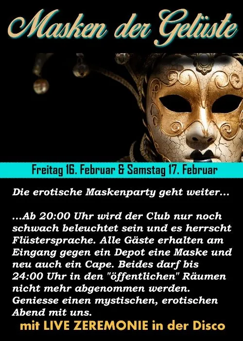 Tauche ein in die Welt der geheimnisvollen und erotischen Maskenpartys im Club. Erlebe einen mystischen Abend voller spannender Überraschungen und knisternder Erotik. Erfahre hier mehr über die kommenden Termine und Preise für die erotische Maskenparty im Club.